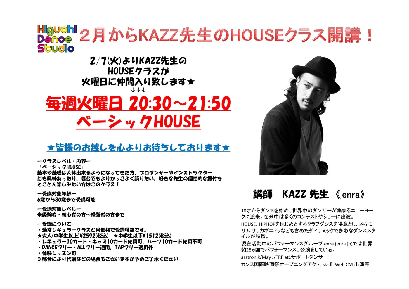 2/7(火)よりKAZZ先生のベーシックHOUSEクラスが