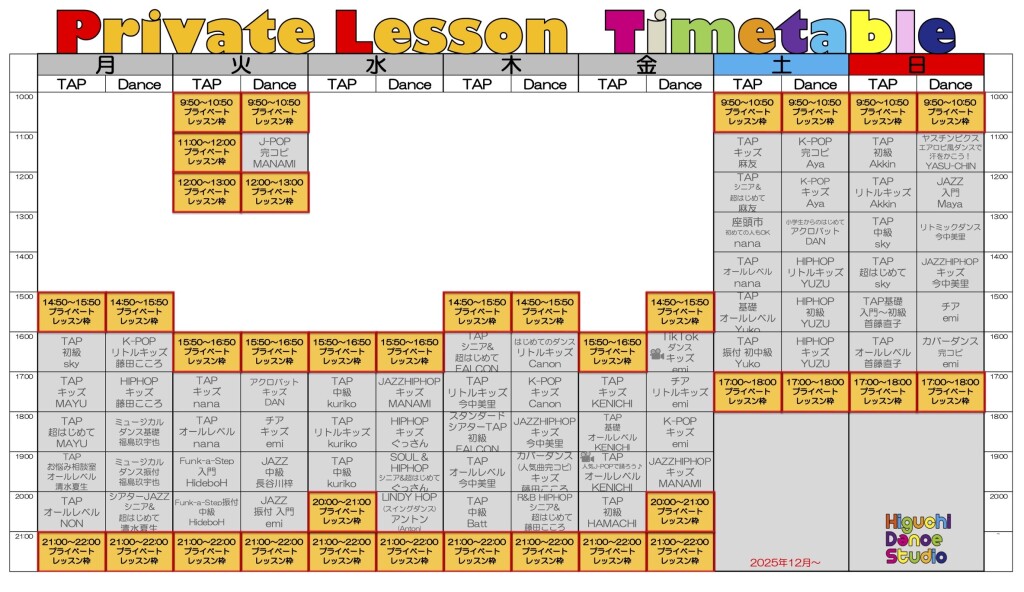 以下画像の赤枠内のお時間がプライベートレッスン対応可能となります。